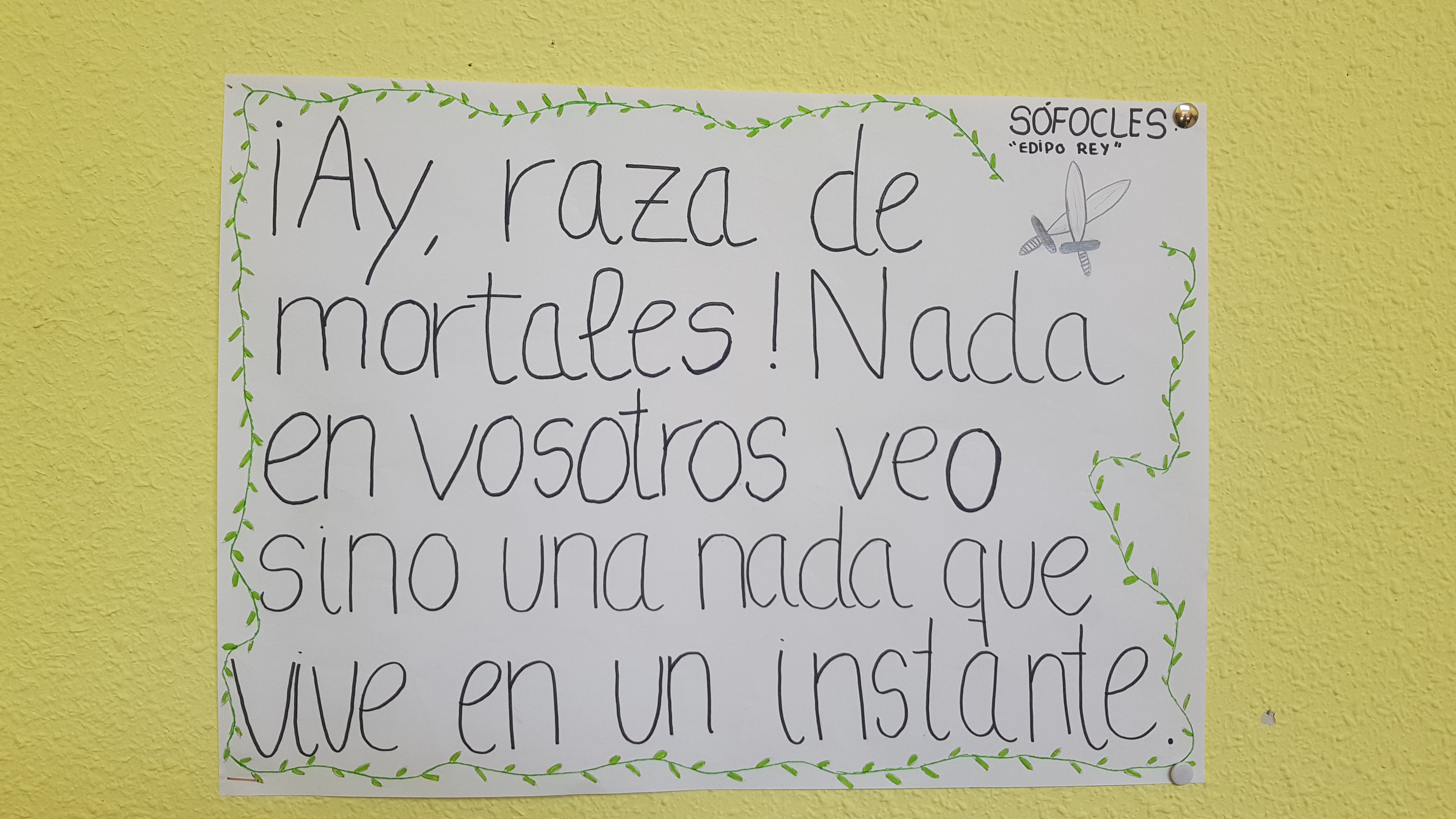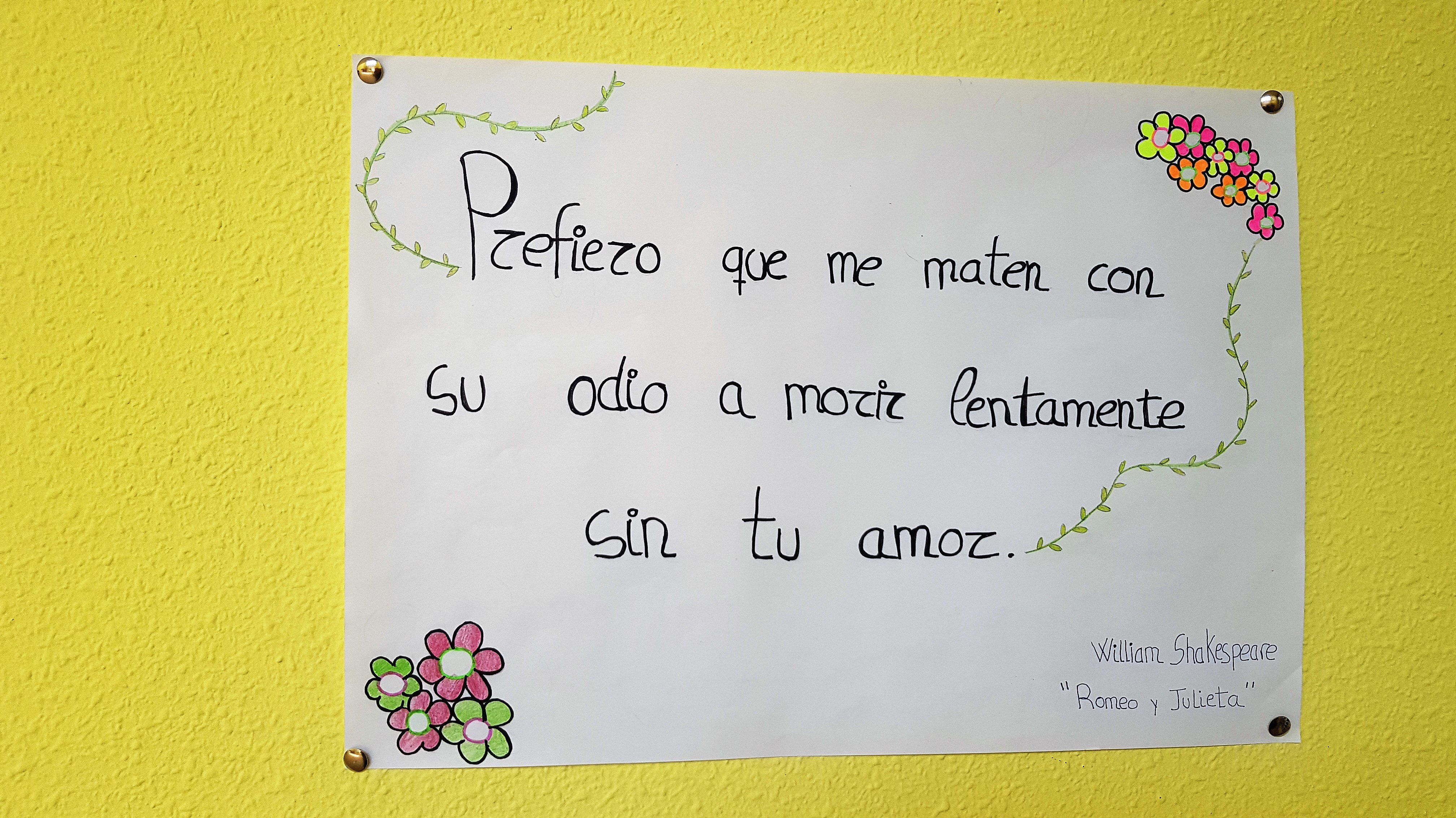 Como todos los años, el 23 de abril se celebra el Día del Libro, en conmemoración de aquel día de 1616 en que murieron tres figuras insignes de la literatura: Miguel de Cervantes, William Shakespeare y el Inca Garcilaso de la Vega. Por este motivo, los alumnos de Literatura Universal de Primero de Bachillerato han elaborado una serie de carteles con breves fragmentos de obras de distintas épocas. Las citas nos ayudan a reflexionar sobre las pasiones humanas y el sentido de la existencia, además de invitarnos a conocer los textos completos.