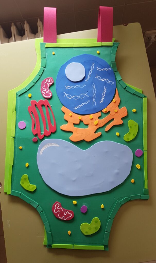 So, we got down to work. Foam of different colours, scissors, hot silicone and a bit of imagination. Step by step, we shaped the plasma membrane, the cell wall, chloroplasts, mitochondria, centrioles, ribosomes… and a few more organelles appeared on our tables. Although all those names seemed a bit strange at first, they ended up becoming our friends. It was impossible not to know the structure and function of the different parts of the cell, as the teacher wouldn’t let us stick anything if we didn’t tell her the function of what we wanted to glue first.