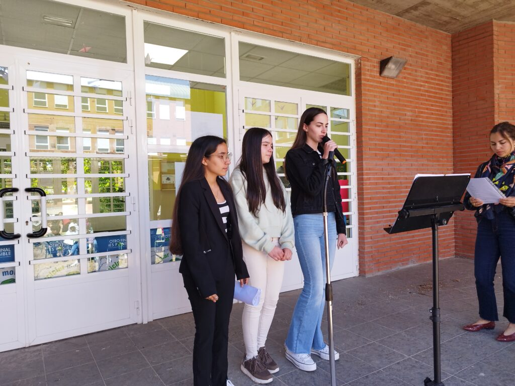 Natalia Barbero, Rocío Sánchez, Andrea González de 1.º de bachillerato recitaron Por tejas y chimeneas de Rosa Chacel