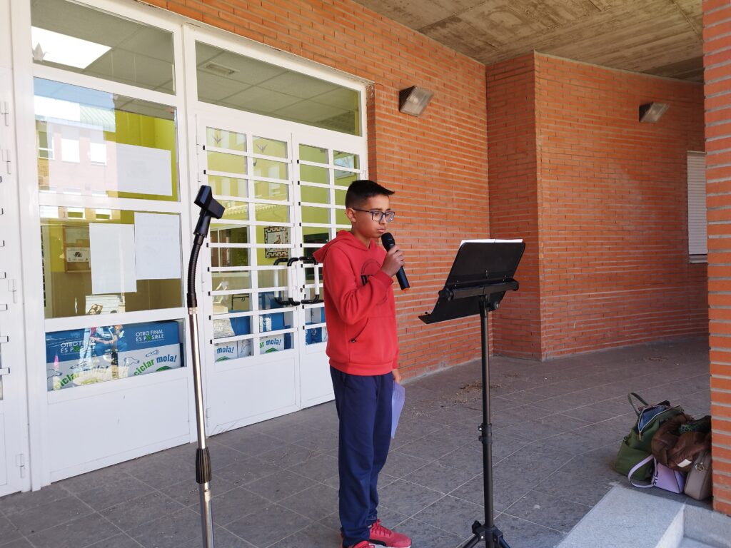 Alejandro González Barbero de 1.º ESO recitó Acaba una guerra en algún lugar del mundo de Sara Búho