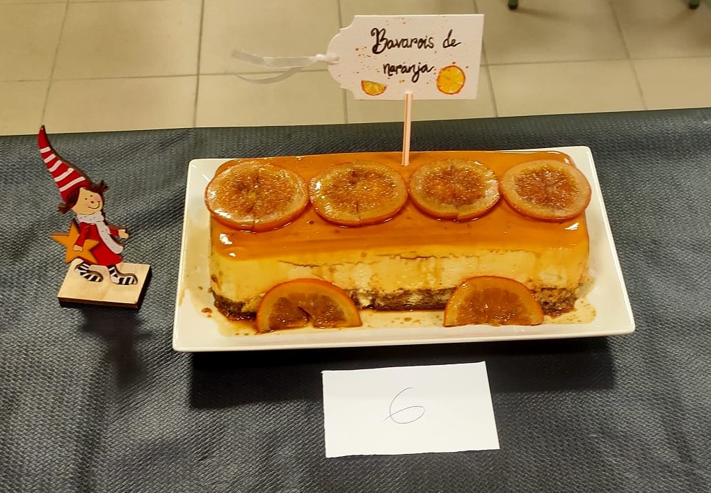 A continuación, desarrollamos el concurso de postres navideños, en el que participaron 8 suculentos platos, presentados por alumnos y profesoras y tras una reñida deliberación del jurado, acabó imponiéndose como ganador el Bavarois de naranja que elaboró Patricia Prieto Cascón, cuyo premio fue un original delantal.