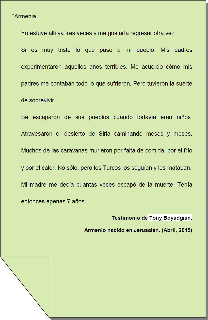 La sombra del genocidio permanece indeleble entre los sucesores de los que lo vivieron, como puede comprobarse en este fragmento de la carta que recientemente (abril de 2015) nos ha remitido un amigo armenio nacido en Jerusalén (Israel). Se reproduce respetando la grafía original: