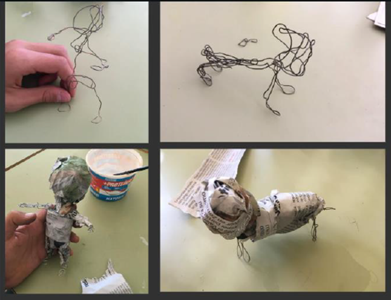 Para trabajar la escultura hemos comenzado por el barro, modelando figuras variadas, pero en la experimentación con otros materiales se ha decidido cambiar al papel con una estructura de alambre. Es como el papel maché utilizado para los gigantes y cabezudos, o para algunas esculturas de las Fallas, que permite aligerar el peso y modelar a nuestro antojo, porque el papel es muy versátil. Se pretende realizar el esqueleto de figuras para su posterior animación, en una versión menos sofisticada que las películas como «O Apostolo«, o «Pedro y el lobo«. En este caso, nuestras estructuras no son de aluminio articuladas y con piel de silicona, pero el alambre nos da la solidez para mantenerse en pie, y las posturas y la flexibilidad suficiente para cambiarlas de postura y moverlas. Los ojos, de cuentas de madera, pueden moverse, crear la sensación de mirada y parpadeo, teniendo que cambiar los párpados fotograma a fotograma.