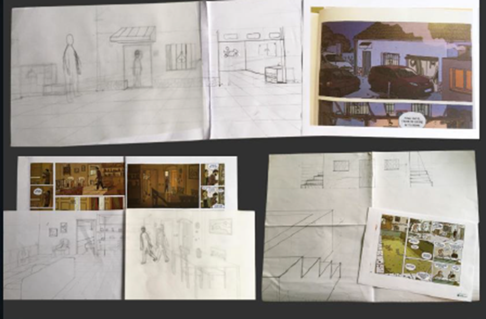 Para cambiar un poco la forma de impartir la perspectiva cónica, hemos pasado de crear cubos en el espacio con el punto de fuga y el de distancia, a crear el decorado de una animación. El proyecto nace de la adaptación de la novela gráfica «Arrugas» (2007), de Paco Roca, a animación para la gran pantalla en el 2011. Del mismo modo, pensamos pasar de la imagen fija del cómic a una animación. Al crear el decorado partiendo de las imágenes del cómic, debemos encontrar el punto de fuga, comprender el espacio completo y amueblarlo; dibujar estos elementos al tamaño adecuado según la perspectiva, y luego, al animar a los personajes, deben ir cambiando la escala de los mismos, teniendo en cuenta si se acercan al espectador o se alejan. Se pretende conocer el entorno de la animación, donde los elementos que se van a mover no aparecen en el fondo, sino que los dibujamos en el papel cebolla, que transparenta el fondo y permite ver cómo los personajes avanzan fotograma a fotograma. Es una aplicación práctica distinta, que permite conocer a un gran artista español de la novela gráfica múltiples veces premiado, vinculando el dibujo con la lectura, y una aplicación del dibujo técnico en el campo del arte y la cultura.