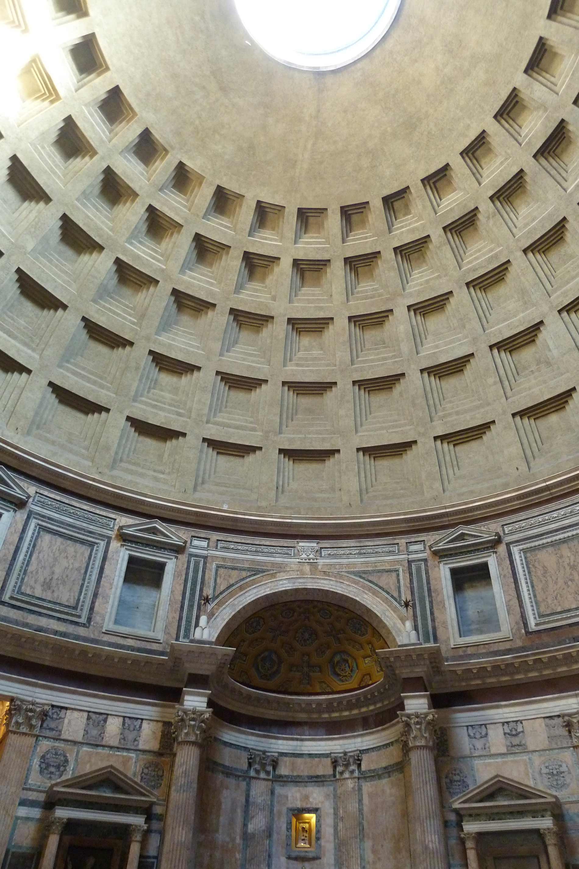 La cúpula está formada en el interior con cinco filas de casetones, que decrecen en tamaño hacia el centro, donde está perforada por un óculo de 9 m de diámetro. Dicha ventana circular permanece abierta, y por ella entra la luz. El óculo estaba rodeado por una cornisa de bronce fijada a la cúpula en la última fila de casetones. Tanto los casetones como el espacio intermedio estaban forrados de bronce.